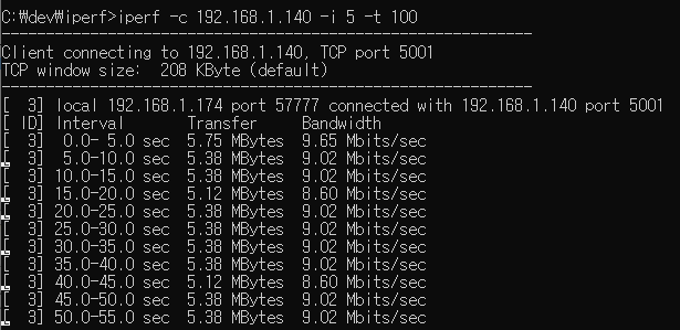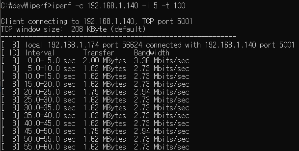 네트웍 전송율 테스트를 위해 PC에서는 iperf 프로그램을 사용하고 STM32에서는 W5500 TCP loopback 테스트 코를 조금 수정해 iperf 클라이언트 코드로 작성했다.