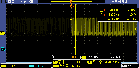STM32G031에서 DMA 방식을 이용하여 SPI 통신을 할경우 340ns로 3배 정도 속도가 빨라진 것을 확인 할 수 있다.