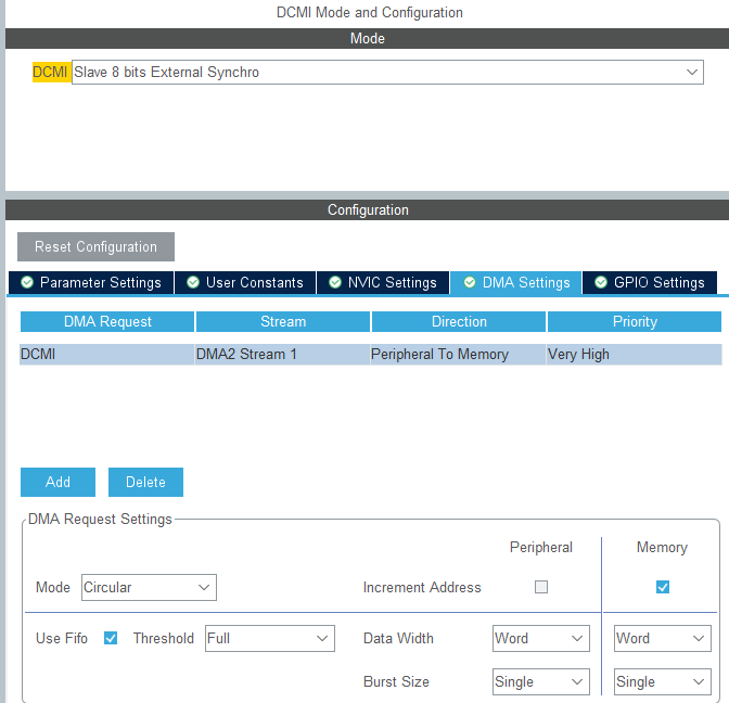 STM32에서 카메라는 DCMI 장치에서 설정 할 수 있다. STM32CubeIDE 를 이용하여 DCMI설정을 해 준다.