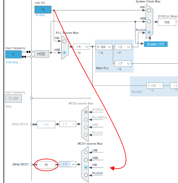 카메라 모듈에는 Master 클럭을 입력해 주어야 하는데 STM32의 PA8을 MCO로 설정하여 16Mhz의 시스템 클럭이 출력 되도록 해 주었다.