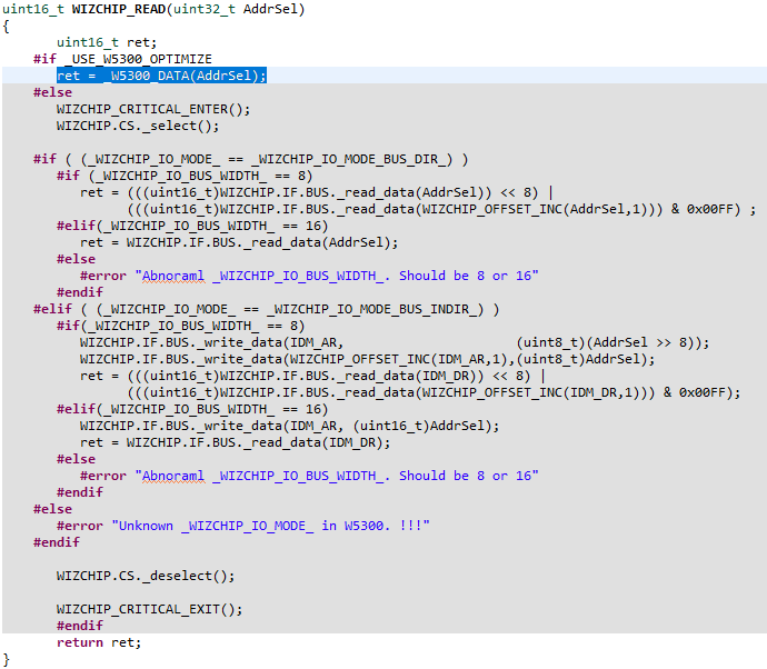 네트워크 전송 속도를 높이려면 W5300에 데이터를 최대한 빨리 읽고 써야 하는데 w5300.c 파일에 있는 WIZCHIP_WRITE(), WIZCHIP_READ() 함수를 수정하면 된다.