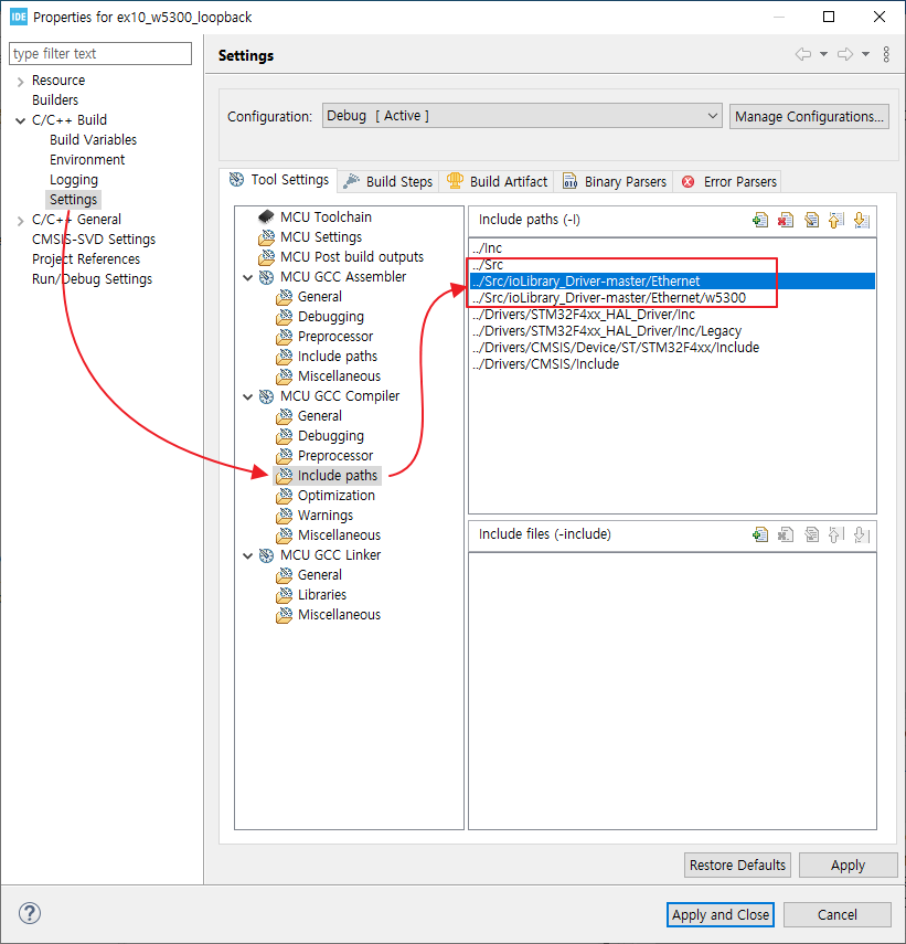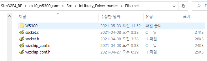 W5300 테스트를 위한 [STM32F4-RP] 보드의 기본 개발환경 설정이 완료 되었다면 다운로드 받은 ioLibrary의 Ethernet 폴더에 W5300관련 코드를 프로젝트에 복사 하고 컴파일 해 보자