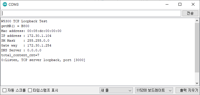 메인 루프에서 loopback_tcps() 함수를 주기적으로 호출 해 TCP 프로토콜을 처리 해 주면 TCP loopback 테스트 펌웨어 코드가 완성된다