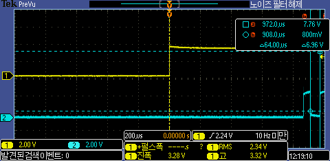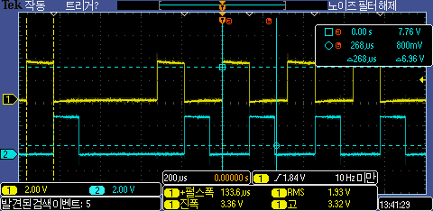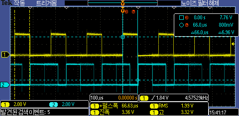 라인 인터럽트 발생시 W5300에서 데이터 전송하는 부분에서 걸리는 시간을 측정한 결과를 스코프로 확인 결과 라인 인터럽트 시간보다 전송하는데 시간이 더 많이 걸리는 것이 확인된다.
