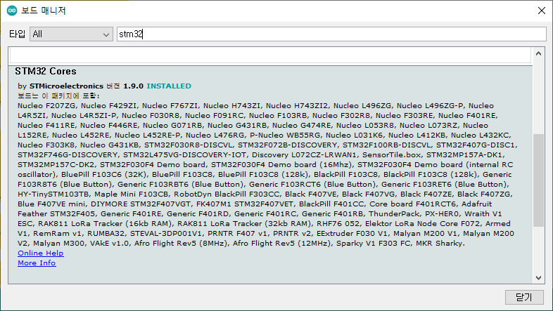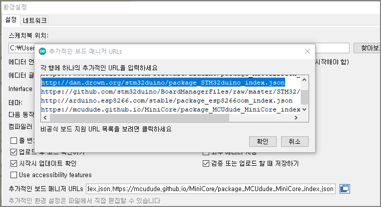우선 Arduino IDE환경에서 STM32 환경 설정이 되어 있지 않다면 보드 링크를 추가 하고
