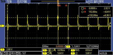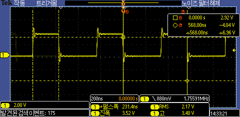 Arduino에서 제공한 GPIO 함수를 이용하여 토글해 보면 230ns 정도 측정된다. 루프 수행 속도는 560ns 정도 된다.