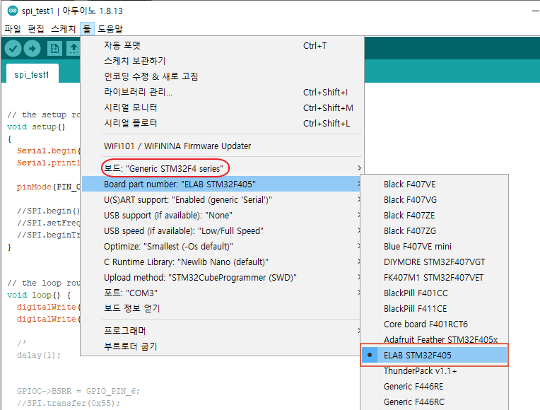 Arduino IDE의 보드 메니저에서 "Generic STM32F4 series" 를 선택하고 새로 만든보드에 맞는 환경설정을 해 주고 새로 생성한 보드파일인 ELAB STM32F405로 선택 한다.