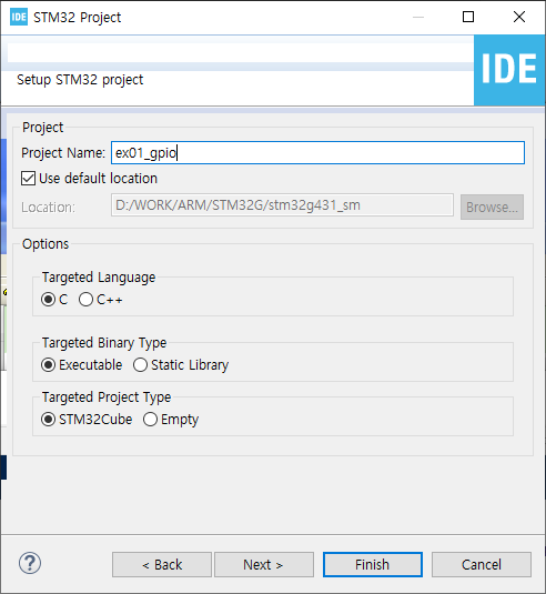 STM32CubeIDE 를 이용하여 STM32G4 프로젝트를 생성한다.