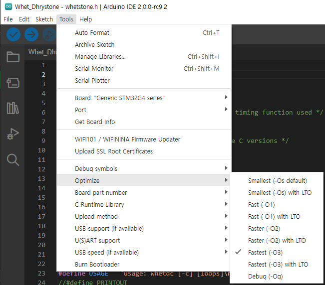 테스트 코드는 STM32H MCU Dhrystone, Whetstone, IIR Benchmark 성능 테스트 를 이용하였다.
