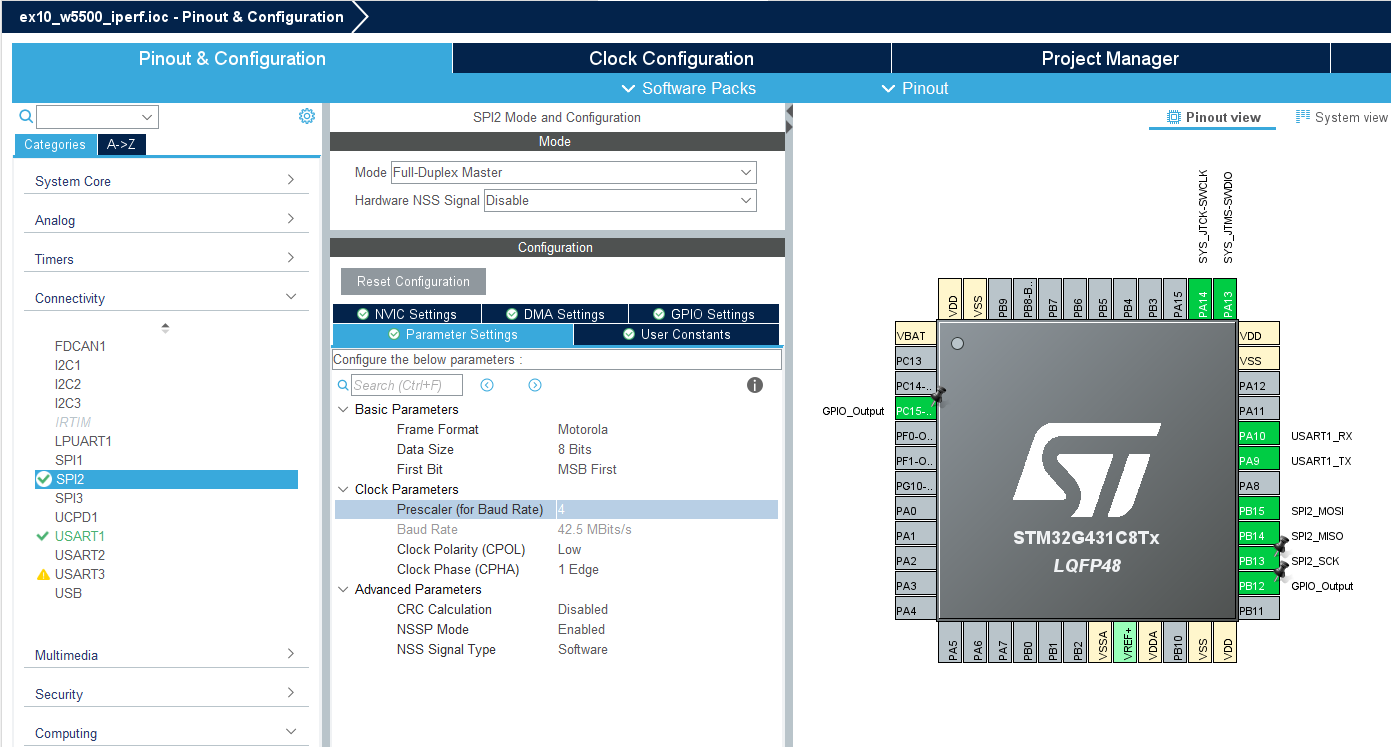 STM32CubeIDE 를 이용하여 STM32G431 프로젝트를 생성하고 SPI설정을 한다.