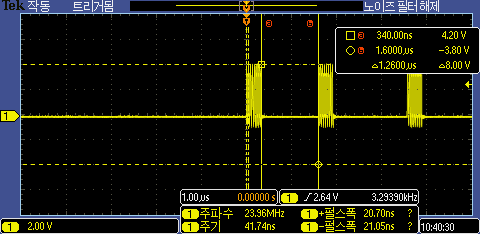 DMA를 사용하면 SPI 전송 간격이 90ns 정도로 10배 이상 빨라지는 것을 확인 할 수 있다.