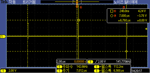 루프 수행 주기는 2us로 측정이 된다. 통일한 코드로 ESP-IDF SDK 환경에서 GPIO 테스트 결과와 비교해 보면 120ns로 5배 정도 느려진다.