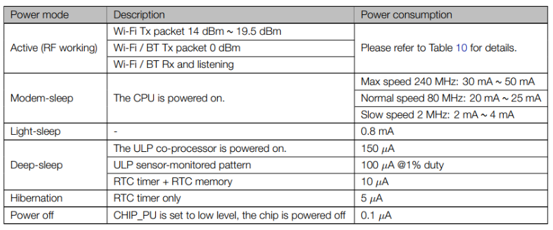 무선 솔루션에서 중요한 스펙중 하나가 저전력 구동이다. ESP32의 경우 6단계의 슬립 모드를 지원한다.