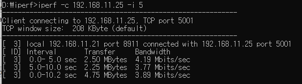 STM32F103과 같이 기본 72Mhz로 구동하고 SPI클럭을 18Mhz로 설정시 iperf 테스트 결과 4Mbps 정도로 측정이 된다.