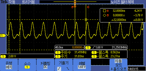 GPIO토글 속도는 8.5ns(30Mhz)로 측정된다. Arduino에서처럼 루프 수행 지연없이 구동 되는것을 확인 할 수 있다.