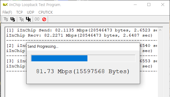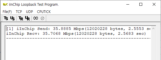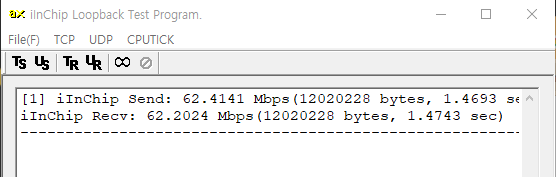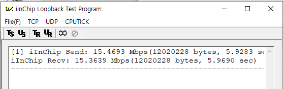 W5300의 TCP 루프백 테스트를 해보자. 전송율이 15Mbps로 상당히 느리다.