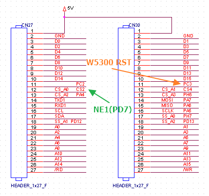 STM32H7 보드에 W5300은 NE1(PD7)에 연결되어 있고 PC3에 리셋이 할당되어 있다.