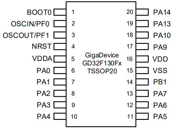 GD21F130Fx 는 STM32F030F4 와 동일한 핀맵이다.
