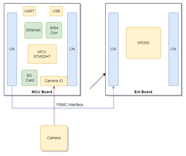 사용된 MCU는 480Mhz로 실행되는 STM32H743이다. W5300의 인터페이스는 주소/데이터 버스이기 때문에 카메라 인터페이스와 함께 데이터 버스를 제공하는 STM32H7 시리즈의 STM32H743을 MCU로 선택 했다.