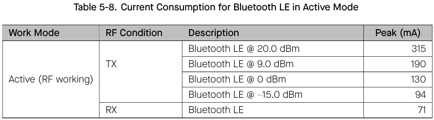 우선 스펙을 확인하니 여전히 WiFi, BLE 모두 소모 전류가 상당히 크다. 아무래도 밧데리 구동 어플리케이션은 무리가 있어 보인다.