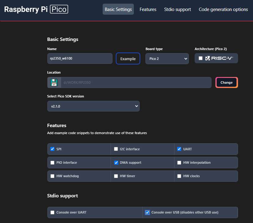 우선 Pi Pico SDK로 W6100 테스트 예제를 생성한다. 하드웨어 세팅에서 SPI, DMA 를 체크하자.