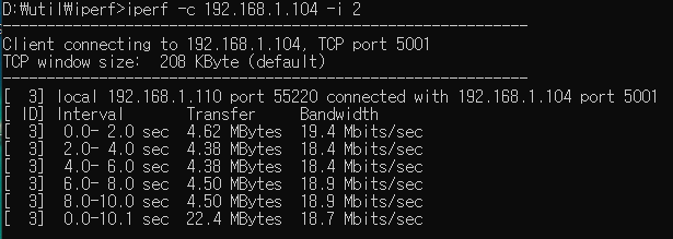 iperf는 단방향 전송만 하기 때문에 양방향 loopback 테스트 보다 2배 정도인 18Mbps 정도로 측정이 된다.