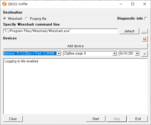 zboss_sniffer.exe 프로그램을 실행하면 TI CC25xx 장치라 인식되면 Zigbee sniffer 가 정상 동작하는 것이다.