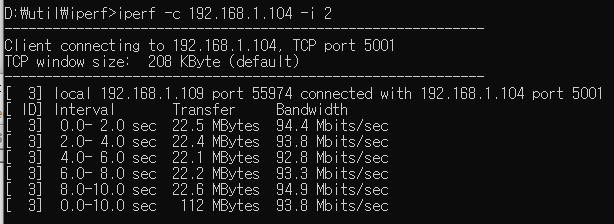32k로 설정하고 TCP 전송률을 측정해 보면 64Mps가 측정된다. 와우 송수신 양방향 속도가 이정도면 단방향 iperf로 측정하면 90Mbps 는 충분히 나올것 같다.