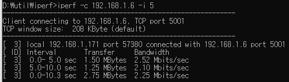 Arduino에서 W6300 lwip 라이브러리를 이용한 iperf 전송률 테스트 결과 2.5Mbps 로 측정 된다. 너무 느리네..