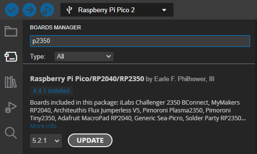먼저 BOARDS MANAGER에서 rp2350 최신버전으로 업데이트 해야 한다.